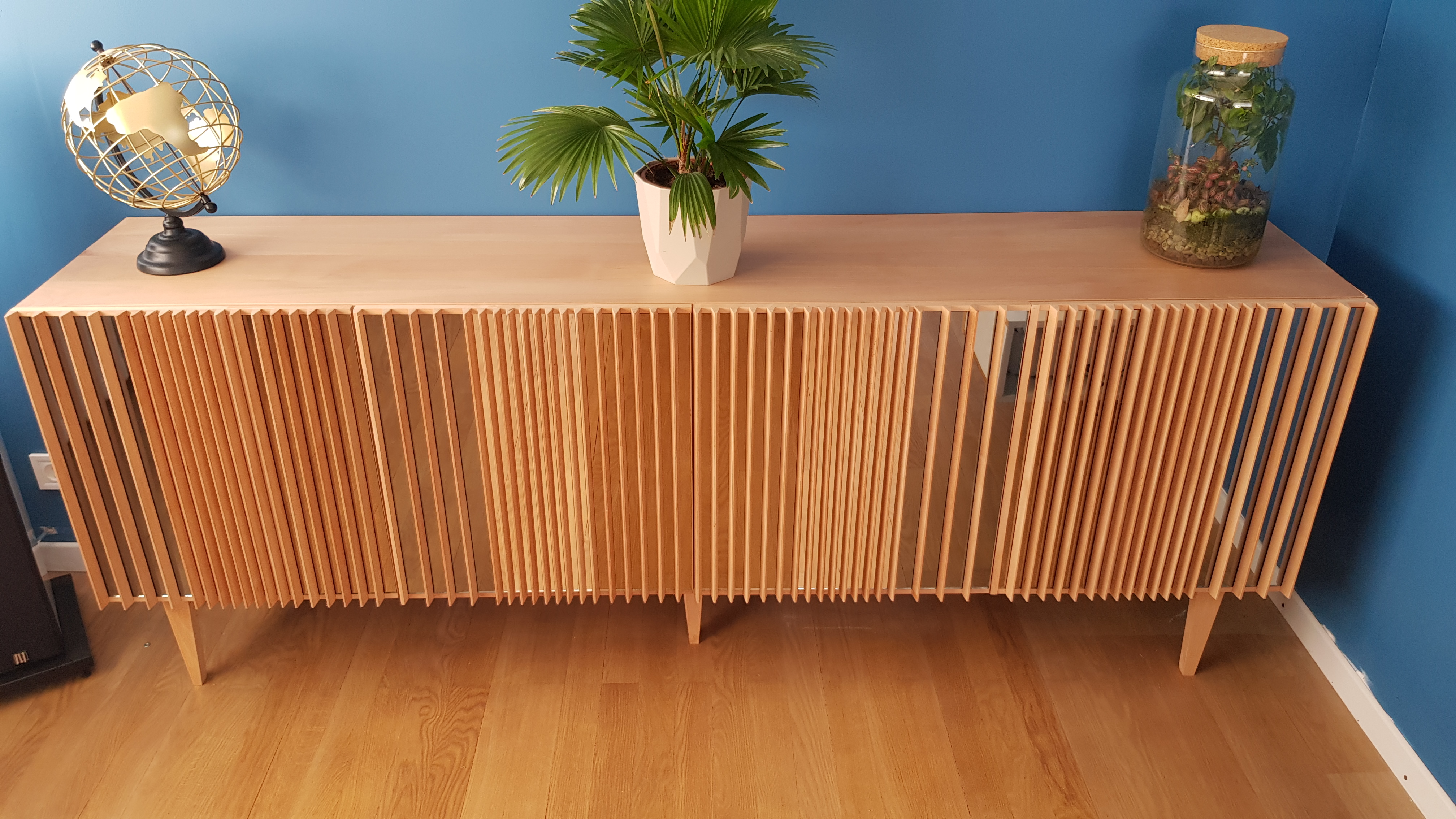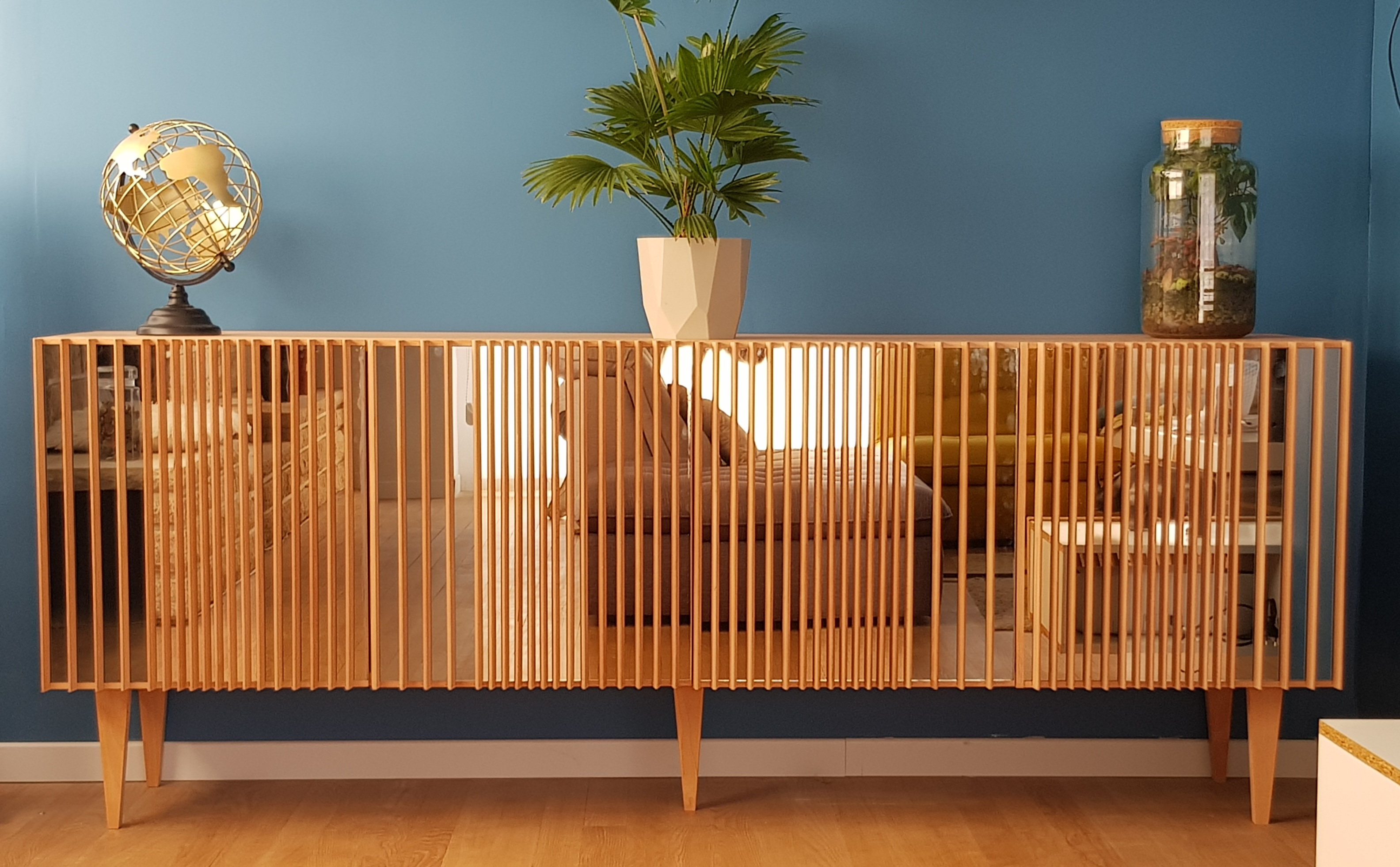 L’enfilade SPECTRE est conçue et fabriquée artisanalement. La structure, les 4 portes et les pieds sont en hêtre massif finition incolore mat afin de conserver la couleur claire et rosée du hêtre brut. Ce qui rend cette enfilade unique ce sont ses portes composées chacune de 3 miroirs teintés (anthracite, argent et bronze) et recouverte d’ailettes en hêtre massif. Les reflets de chaque miroir sont différents et l’espacement entre les ailettes l’est aussi, ce qui donne des points de vue changeants en fonction d’où l’on se trouve. L’ouverture des portes se fait par le système push pull. DIMENSIONS : L.210CM X H.80CM X P.40CM (SUR MESURE POSSIBLE)