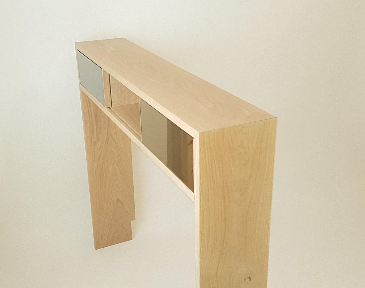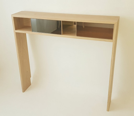 La console SPECTRE conçue et fabriquée artisanalement se distingue par ses trois miroirs teintés (anthracite, argent et bronze) en façade. Elle attire le regard par ses reflets changeants. La structure réalisée en chêne massif la rend très robuste. Composée de trois espaces de rangement dont deux fermés par des portes coulissantes, cette console trouvera parfaitement sa place dans une entrée ou un salon. DIMENSIONS : L.100CM X H.95CM X P.20CM (SUR MESURE POSSIBLE)