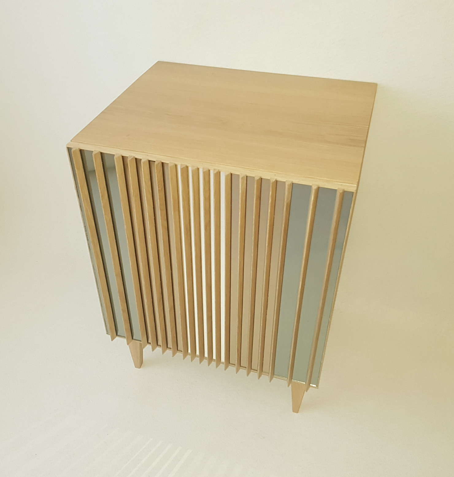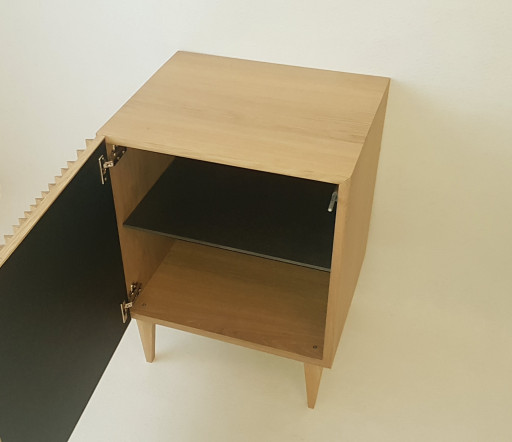 Le cube SPECTRE conçu et fabriqué artisanalement est une déclinaison de l’enfilade SPECTRE. La structure, la porte et les pieds sont en chêne massif finition incolore mat afin de conserver la couleur claire du chêne brut. L’étagère amovible à l’intérieur est quand à elle en valchromat. Ce qui rend ce meuble unique c’est sa porte composée de 5 miroirs teintés (2 anthracite, 1 argent et 2 bronze) recouverts d’ailettes en chêne massif. La conception de cette porte permet de pouvoir mettre cote à cote plusieurs cubes SPECTRE tout en gardant une homogénéité des motifs. Les reflets de chaque miroir sont différents et l’espacement entre les ailettes l’est aussi, ce qui donne des points de vue changeants en fonction d’où l’on se trouve. L’ouverture de la porte se fait par le système push pull. Cette déclinaison se veut modulable. Dimension lxhxp : 55x78x48cm.